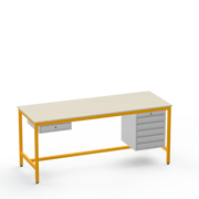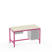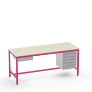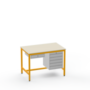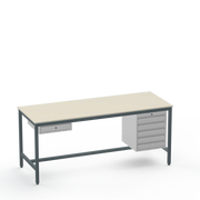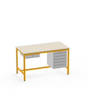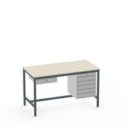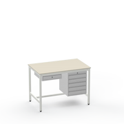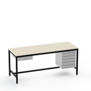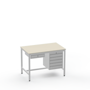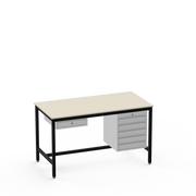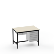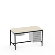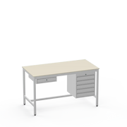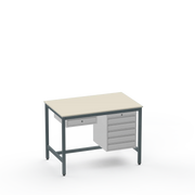 Medium Duty Anti-Static (ESD) Electronics Workbench with durable Laminate Worktop and asymmetrical storage: Single Drawer Unit on the left side, 5 Drawer Unit on the right side.