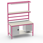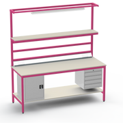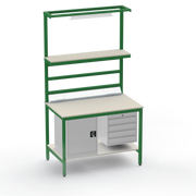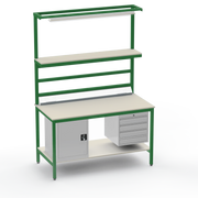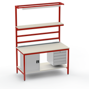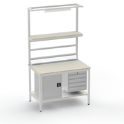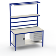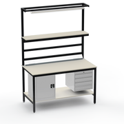 Need secure, organised storage? The left-side cupboard and right-side 4-drawer unit keep tools and components lockable and accessible, reducing clutter and boosting productivity. Upper and lower shelves with support bars maximise vertical space, while the lighting rail and fitted light ensure precise visibility for intricate tasks. Benchtop electrical outlets power your equipment right where you need it.